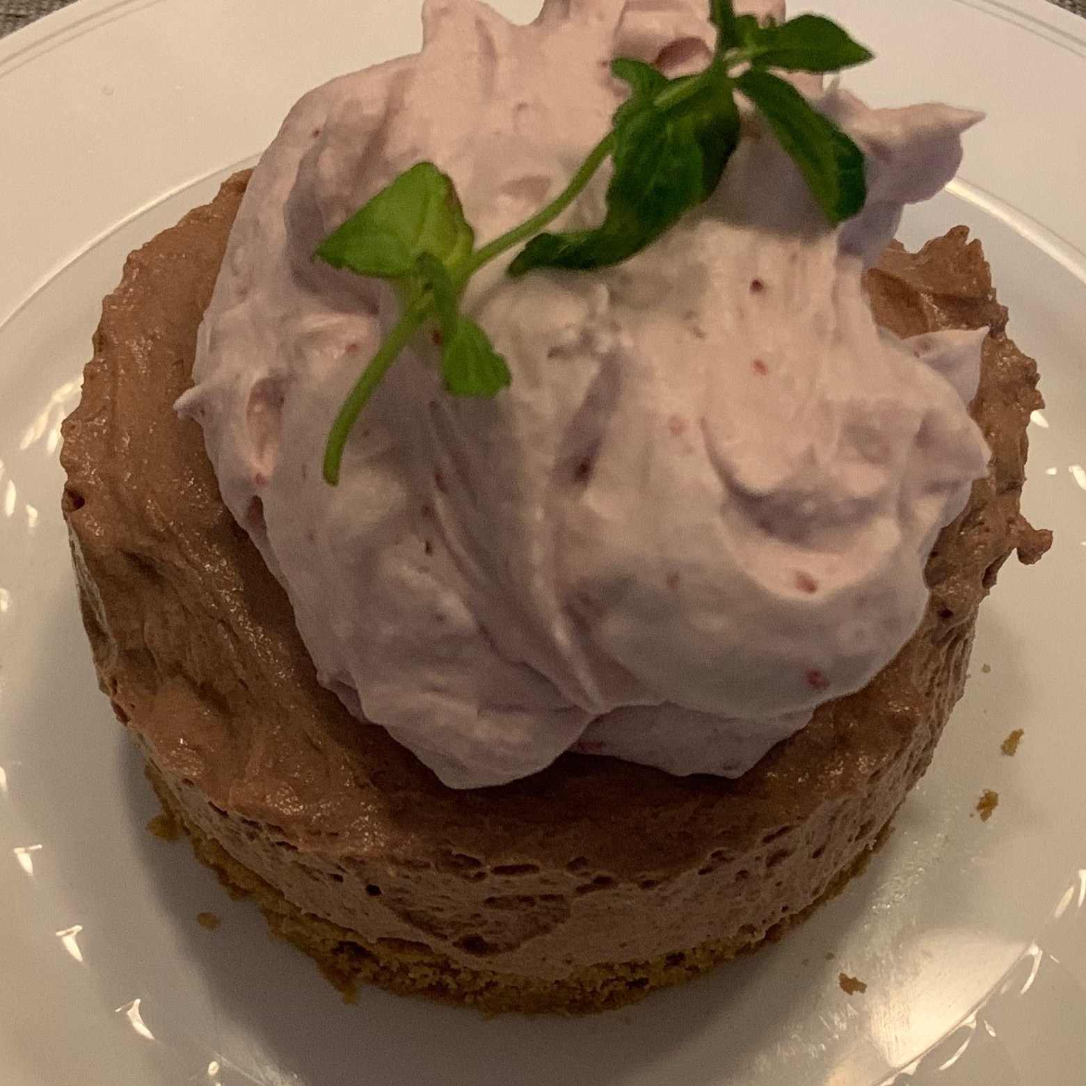 Dessert: GF graham crust, chocolate cream cheese mouse, with a whipped cream shiraz cherry topping.